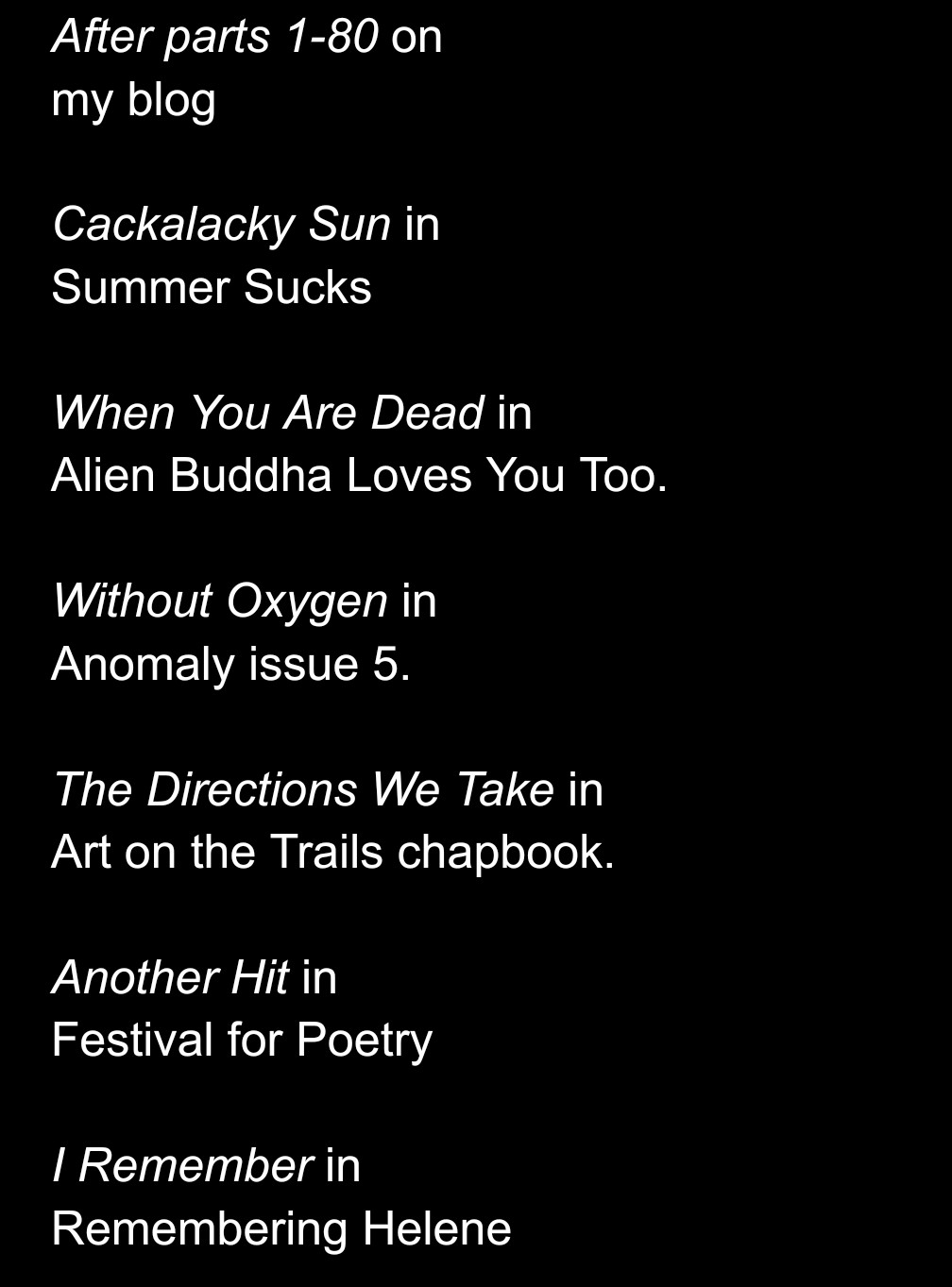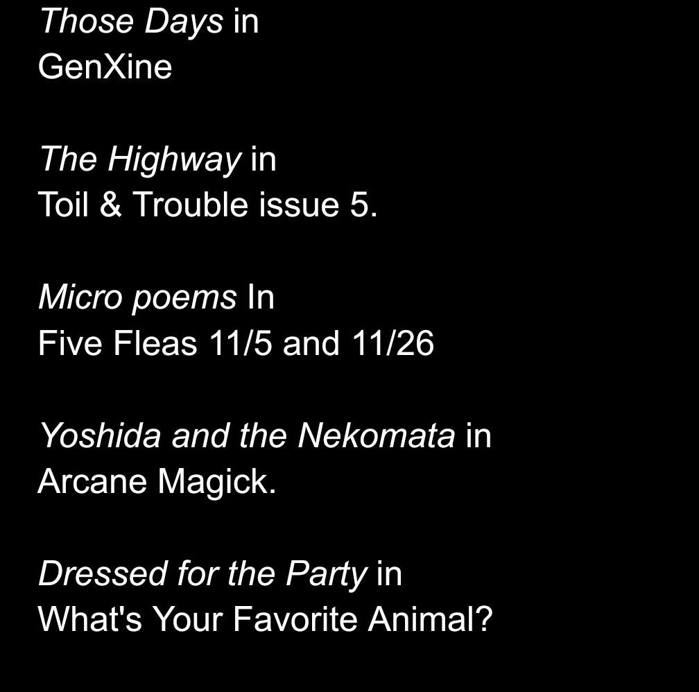 So I started the year going it was time for a change and to get back to creating stuff. Writing called me the most. Here’s where I was lucky enough to get acceptance this year. Got some big hitters on the horizon for 2026 and maybe one or two left for this year. Thanks to anyone who has read any of these.